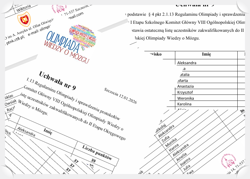Na podstawie § 4 pkt 2.1.13 Regulaminu Olimpiady i sprawdzeniu protokołów szkolnych z I Etapu Szkolnego Komitet Główny VIII Ogólnopolskiej Olimpiady Wiedzy o Mózgu przedstawia ostateczną listę uczestników zakwalifikowanych do II Etapu Okręgowego VIII Ogólnopolskiej Olimpiady Wiedzy o Mózgu. Lista dostępna jest na naszej stronie internetowej w zakładce "Dokumenty do pobrania" > "VIII Olimpiada" - kliknij